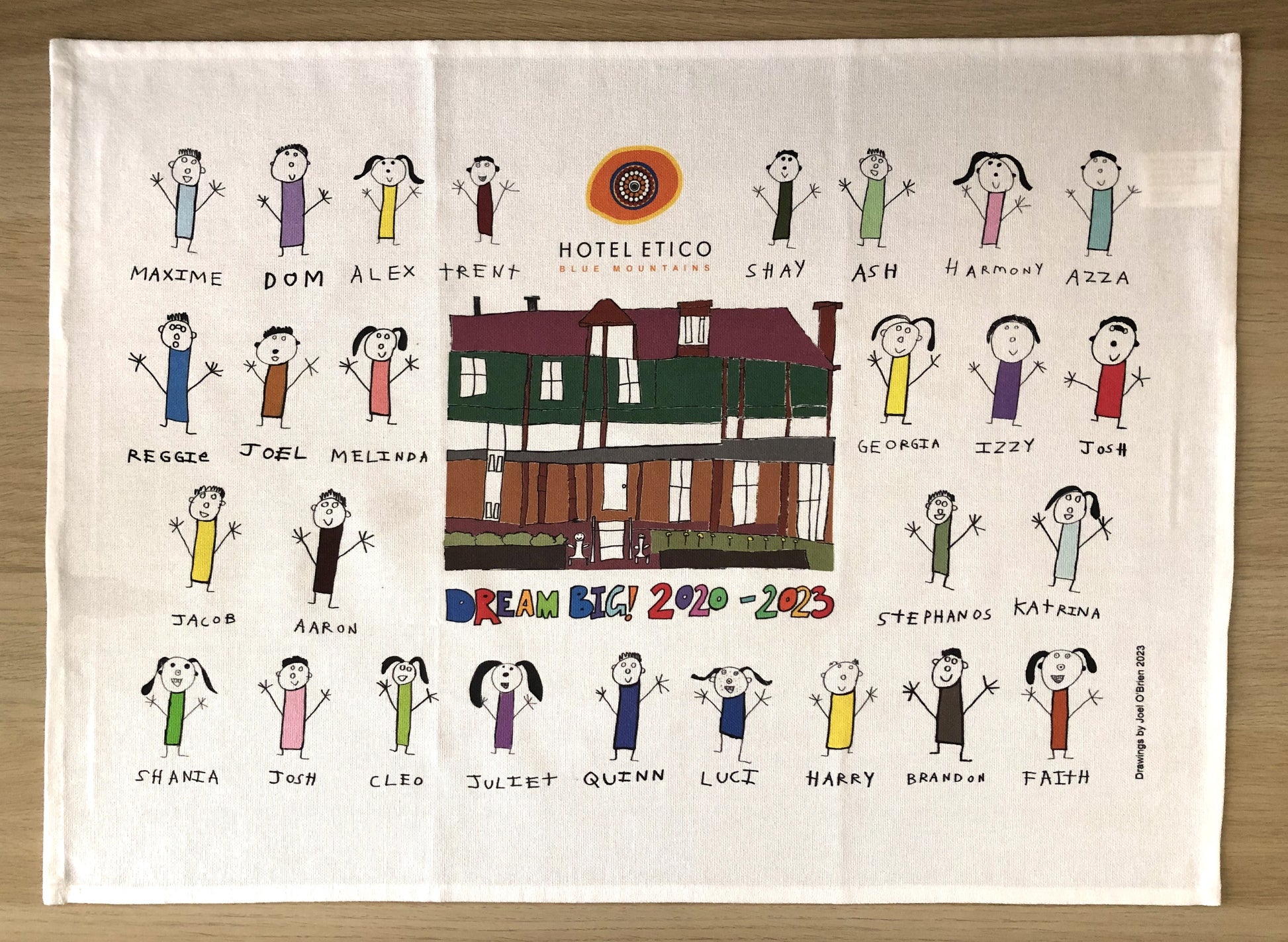 Limited edition DREAM BIG tea towel. Tea towel printed on cotton by Keepsake tea towels. Featuring all trainees of the Hotel Etico program from 2020-2023. Tea towel drawings made by trainee Joel O'Brien.